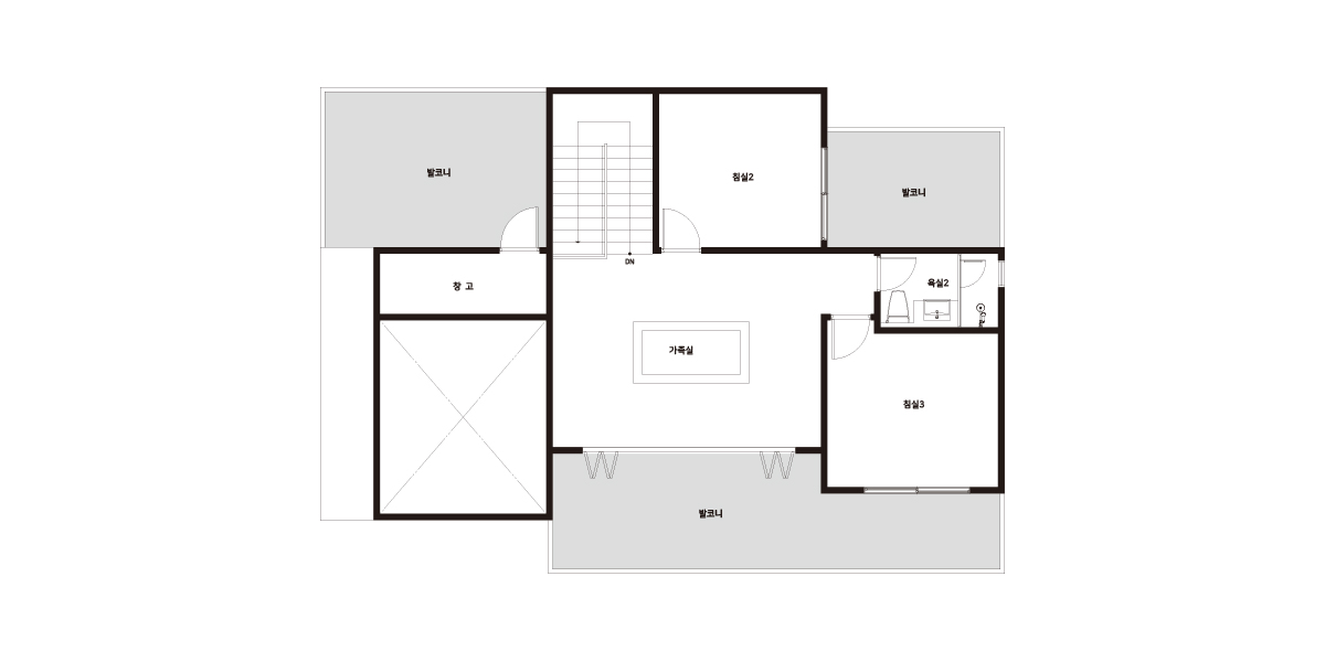 | 2F | 2층 구성: 창고, 침실2, 침실3, 욕실2, 가족실 |
