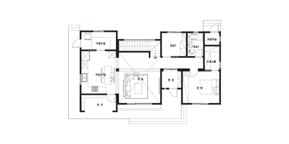 Floor Plan| 1F | 1층 구성: 현관, 거실, 주방/식당, 다용도실, 안방, 드레스룸, 욕실1, 보일러실, 침실1 |