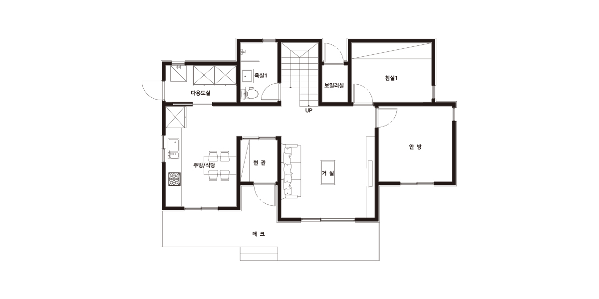 Floor Plan| 1F | 1층 구성: 현관, 거실, 주방/식당, 다용도실, 안방, 드레스룸, 욕실1, 보일러실 |