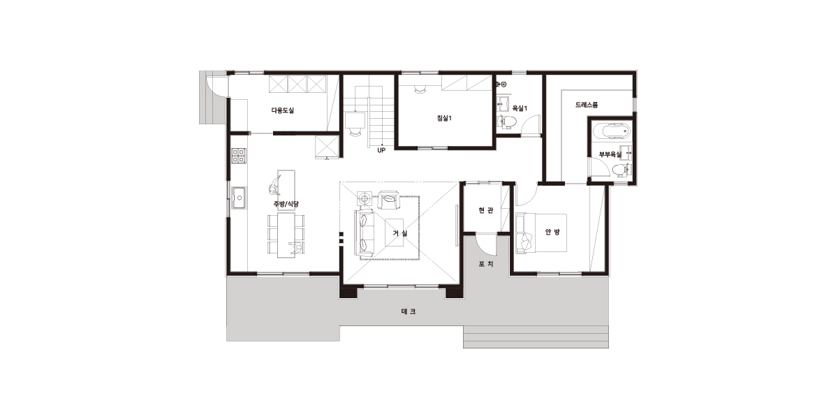Floor Plan| 1F | 1층 구성: 현관, 거실, 주방/식당, 다용도실, 안방, 드레스룸, 부부욕실, 침실1, 욕실1 |