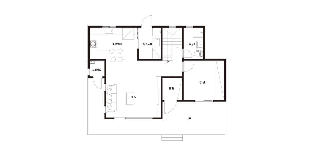 Floor Plan| 1F | 1층 구성: 현관, 거실, 주방/식당, 다용도실, 욕실1, 안방, 보일러실 |