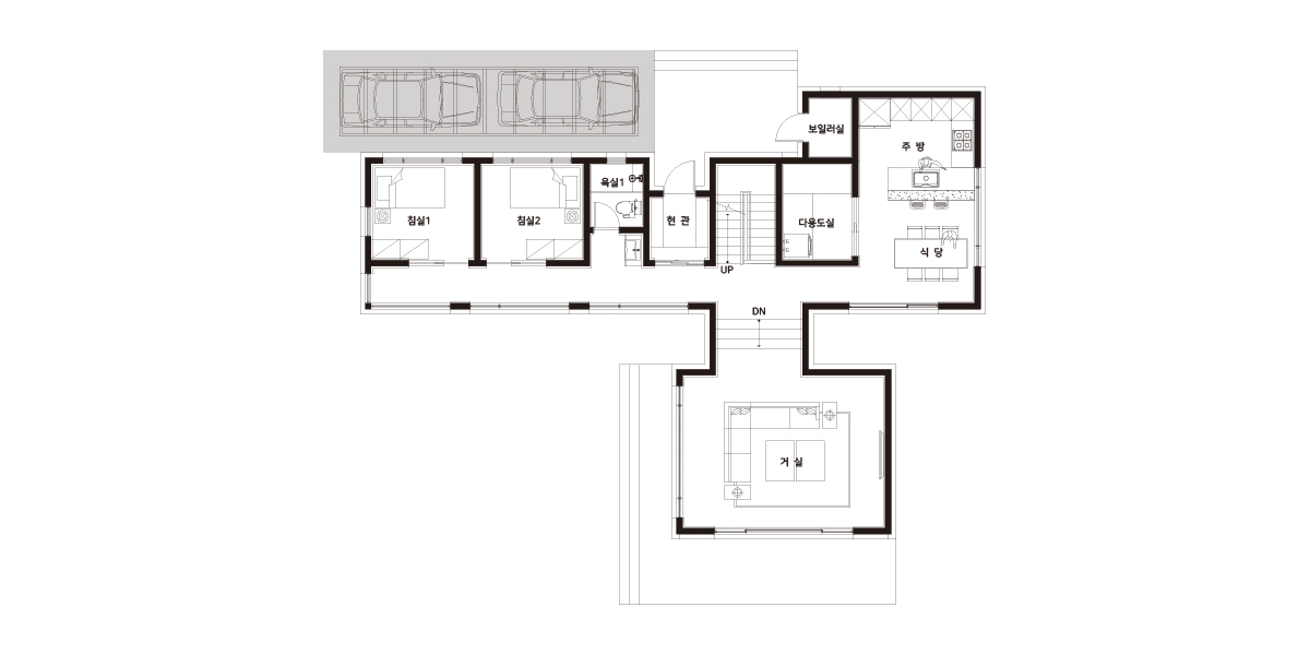 Floor Plan| 1F | 1층 구성: 현관, 거실, 주방, 식당, 침실1, 침실2, 욕실1, 다용도실, 보일러실 |