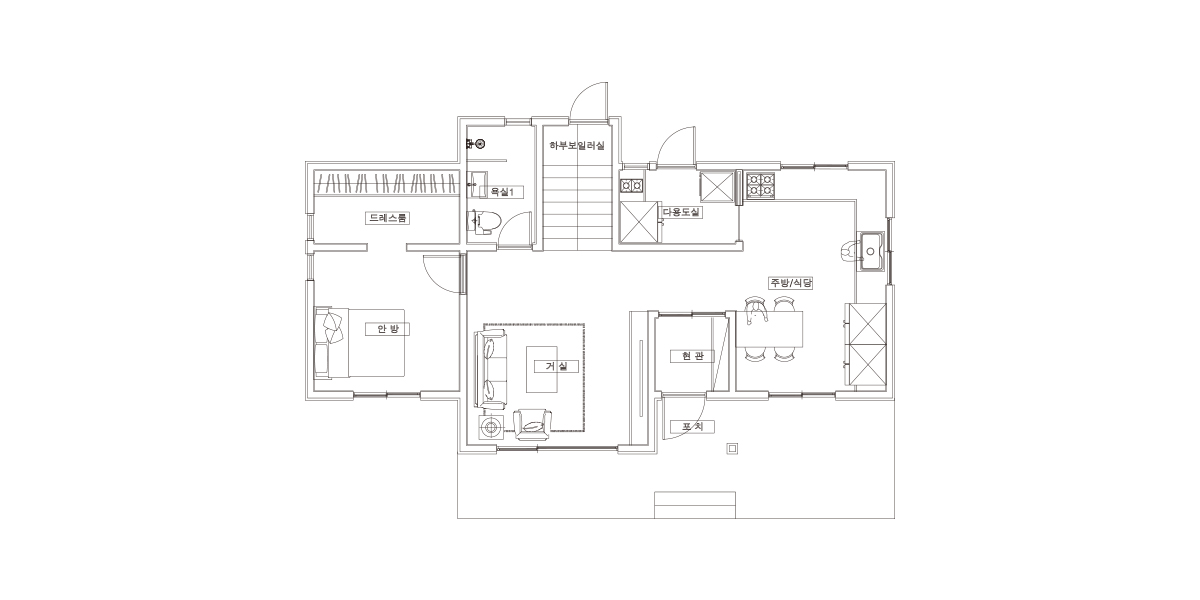 Floor Plan| 1F | 1층 구성: 현관, 거실, 주방/식당, 안방, 드레스룸, 다용도실, 욕실1 |