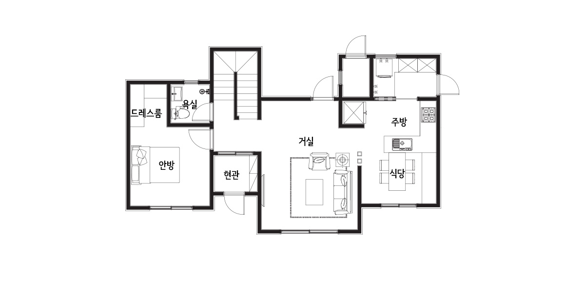 Floor Plan| 1F | 1층 구성: 현관, 거실, 주방, 식당, 안방, 드레스룸, 욕실 |