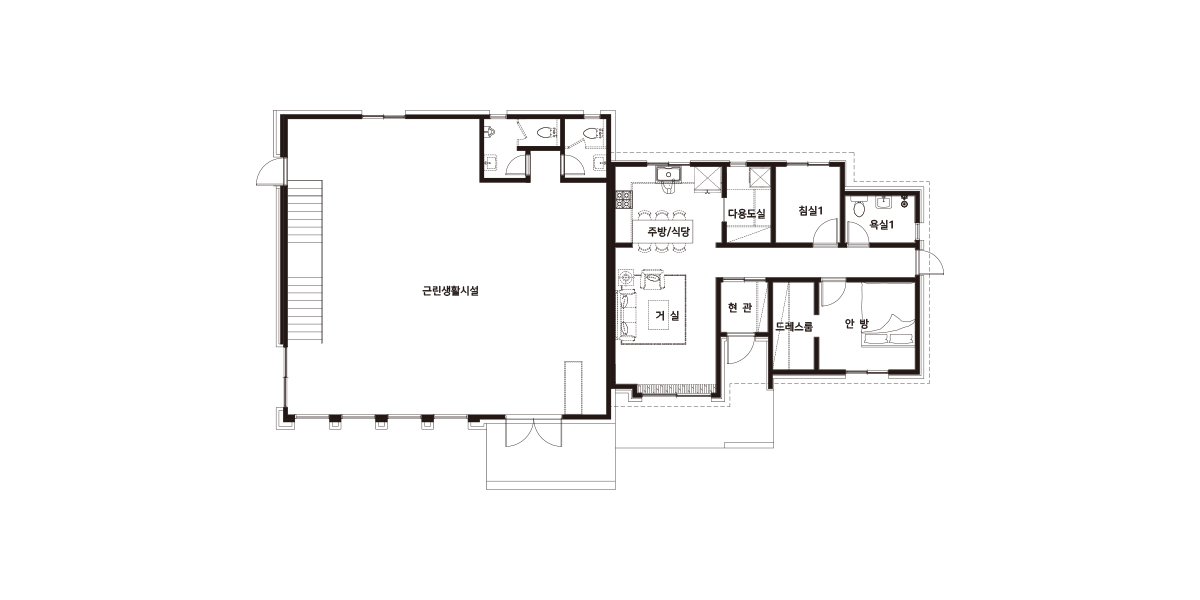 Floor Plan| 1F | 1층 구성: 근린생활시설, 주방, 화장실, 다용도실, 작은방, 욕실, 안방, 드레스룸, 현관, 거실 |
