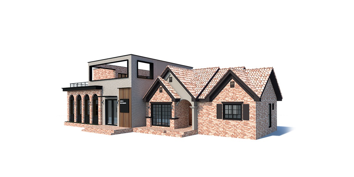 상업공간의 외관은 붉은 파벽돌&목재사이딩으로 고급스러움을 연출했다.