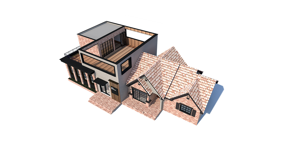 우측의 주거공간 지붕은 스페니쉬기와를 사용하여 주거공간만의 부드러운 느낌을 표현했다.