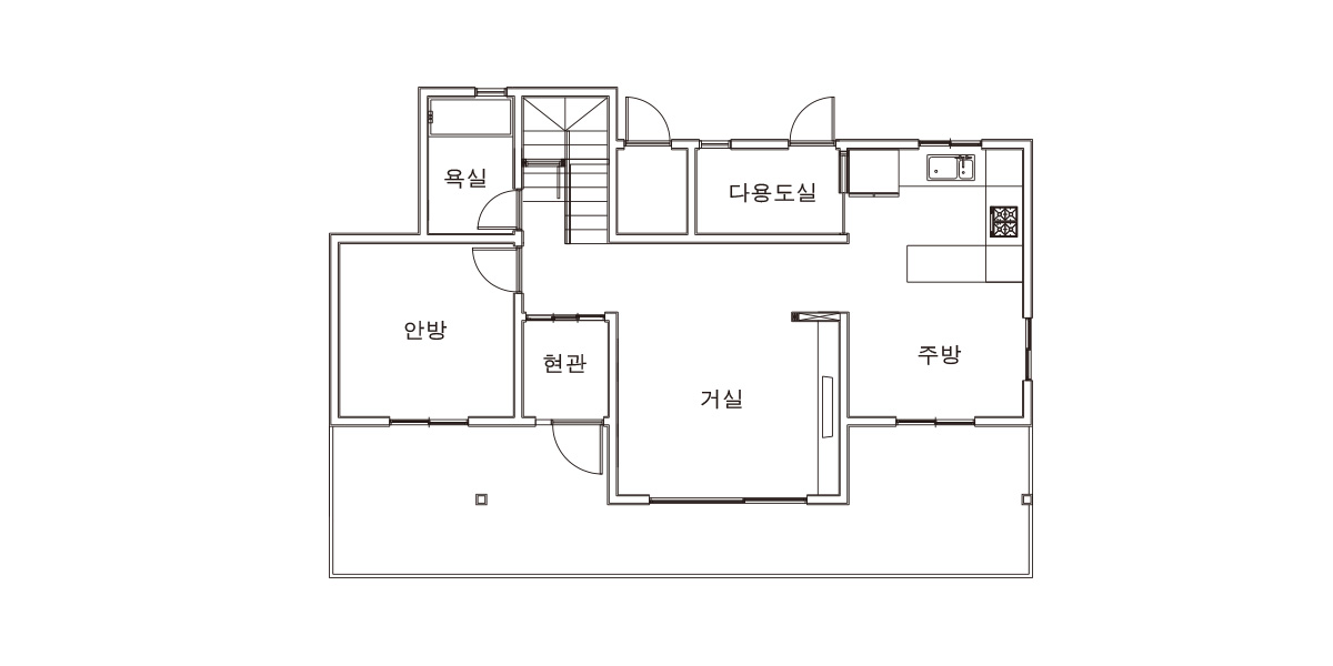 Floor Plan| 1F | 1층 구성: 현관, 거실, 주방, 안방, 다용도실, 욕실 |